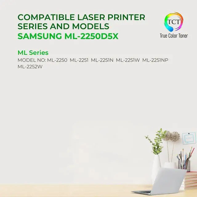 TCT offers quality Samsung ML2250D5 ML-2250D5 High Yield compatible replacement cartridges that fit effortlessly into your printer. You will find crisp, clear prints with consistently dark tones and sharp images in every single print job. Get professional quality prints every time and save a bundle with True Color Toners high quality printing supplies!