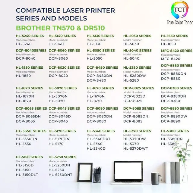 TCT offers quality TN-570 DR-510 compatible replacement drum units that fit effortlessly into your printer. You will find crisp, clear prints with consistently dark tones and sharp images in every single print job. Get professional quality prints every time and save a bundle with True Color Toners high quality printing supplies!