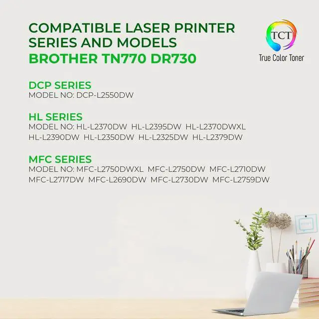 The TCT TN770 DR730 is compatible with the following printer models: Brother MFC-L2750DW, MFC-L2750DWXL, HL-L2370DW, HL-L2370DWXL printers.