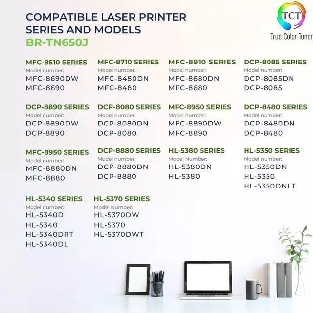 The TCT TN650J is compatible with the following printer models: Brother HL 5340D, 5350DN, 5370DW, 5370DWT, DCP 8080DN, 8085DN, MFC 8480DN, 8680DN, 8690DW, 8890DW.