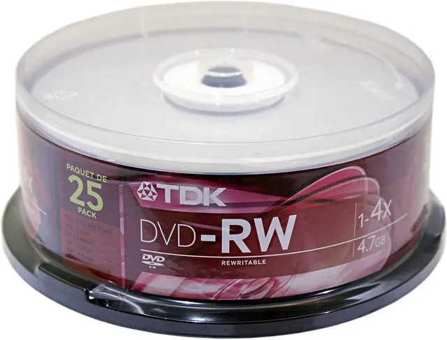 | Features | Single sided 4X compatible DVD-RW for general use 25pk. 4.7GB TDK DVD-RW rewritable media delivers unrivaled performance and reliability even after hundreds of uses. Repeatedly record, erase and re-record the same disc. TDK DVD-RW media is ideal for recording video and images, backing up your hard drive or just about any application where you wish to overwrite old data with new. DVD-RW format media is compatible with virtually all multi-format computer drives and most home DVD players. |