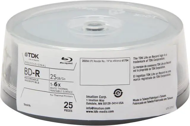 TDK Life on Record Professional BD-R Thermal Printable Surface recording media is specially formulated to meet the needs of high-volume business users. Each disc features a print-to-the-hub surface that maximizes the capabilities of thermal disc printing systems, facilitating superior print durability.