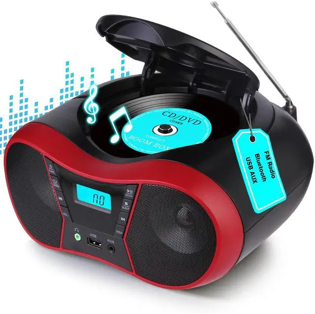 Boombox CD Player Portable, Portable CD Players for Home, Radio CD Player Stereo with AUX/USB/FM/Bluetooth, AC/Battery, Sleep Timer, Boom Box with Bluetooth Gift for Kids, Seniors, Home, Red