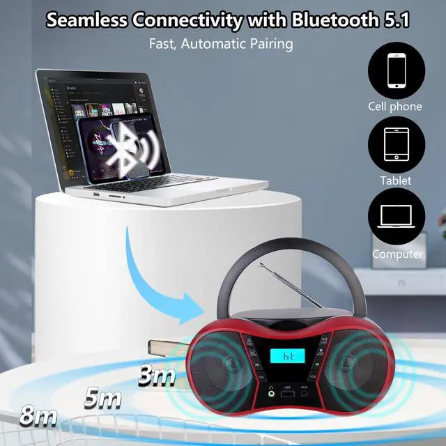 Seamless Wireless ConnectionThis radio cd player combo for home features advanced Bluetooth 5.1 technology for a stable connection of up to 26 feet with smartphones, tablets and laptops. Fast pairing ensures uninterrupted streaming and minimizes audio lag so you can enjoy your favorite playlists