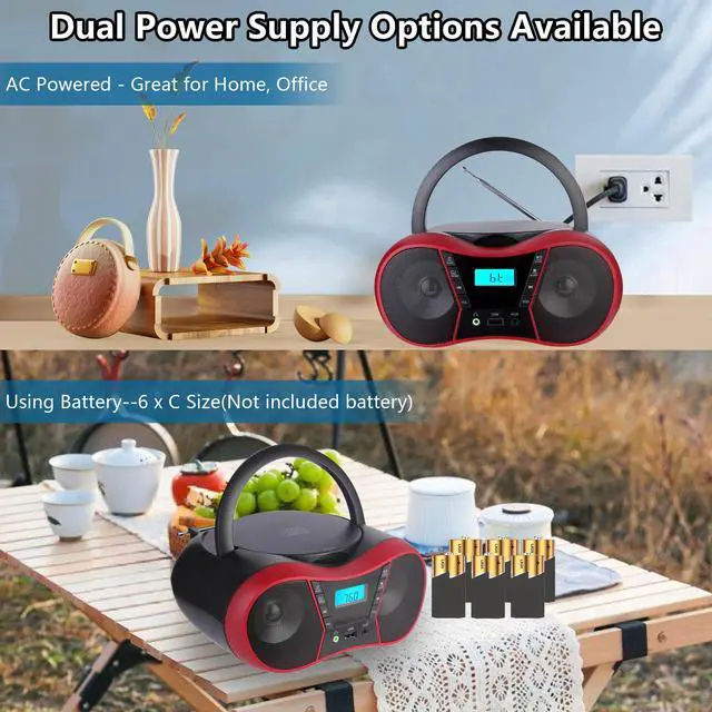Powerful Stereo Sound SystemThis cd boombox features dual high-performance speakers delivering crisp highs and deep lows for a room-filling sound experience. Portable with AC power (adapter included) or 6 C batteries (not included). Includes 3.5 mm headphone jack for private listening