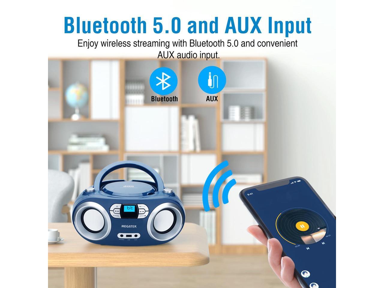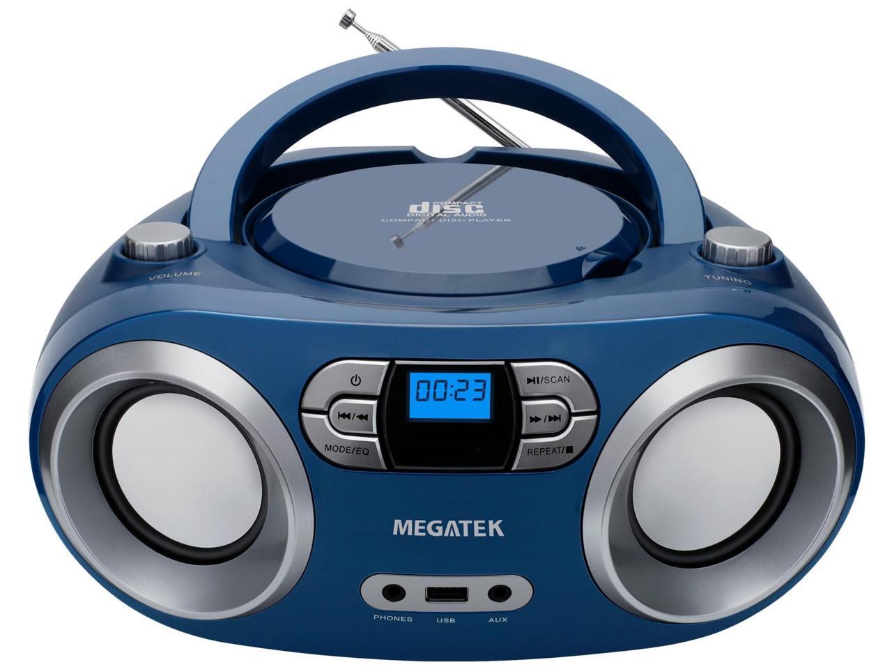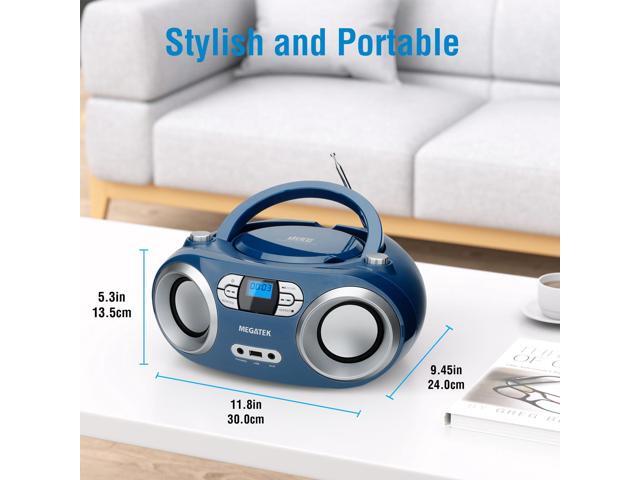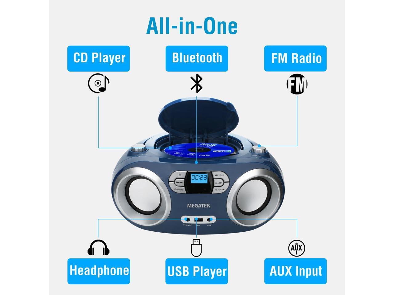 MEGATEK Portable CD Player Boombox with FM Radio, Bluetooth, USB Port, AUX Input, and Headphone Jack CD-R/CD-RW/MP3-CD Compatible, Clear Stereo Sound, Backlit LCD Display Blue Jay