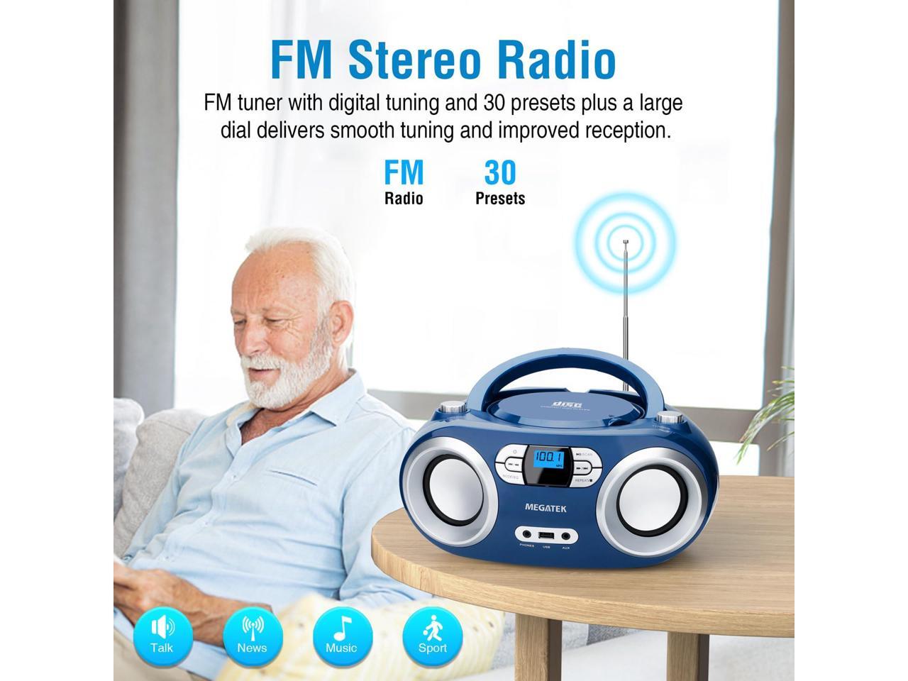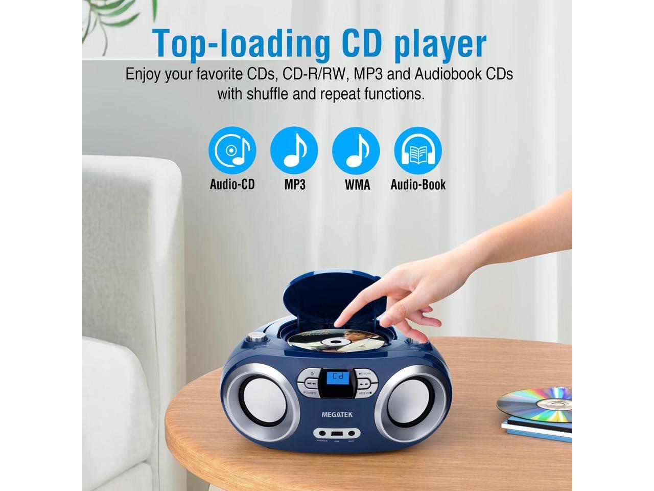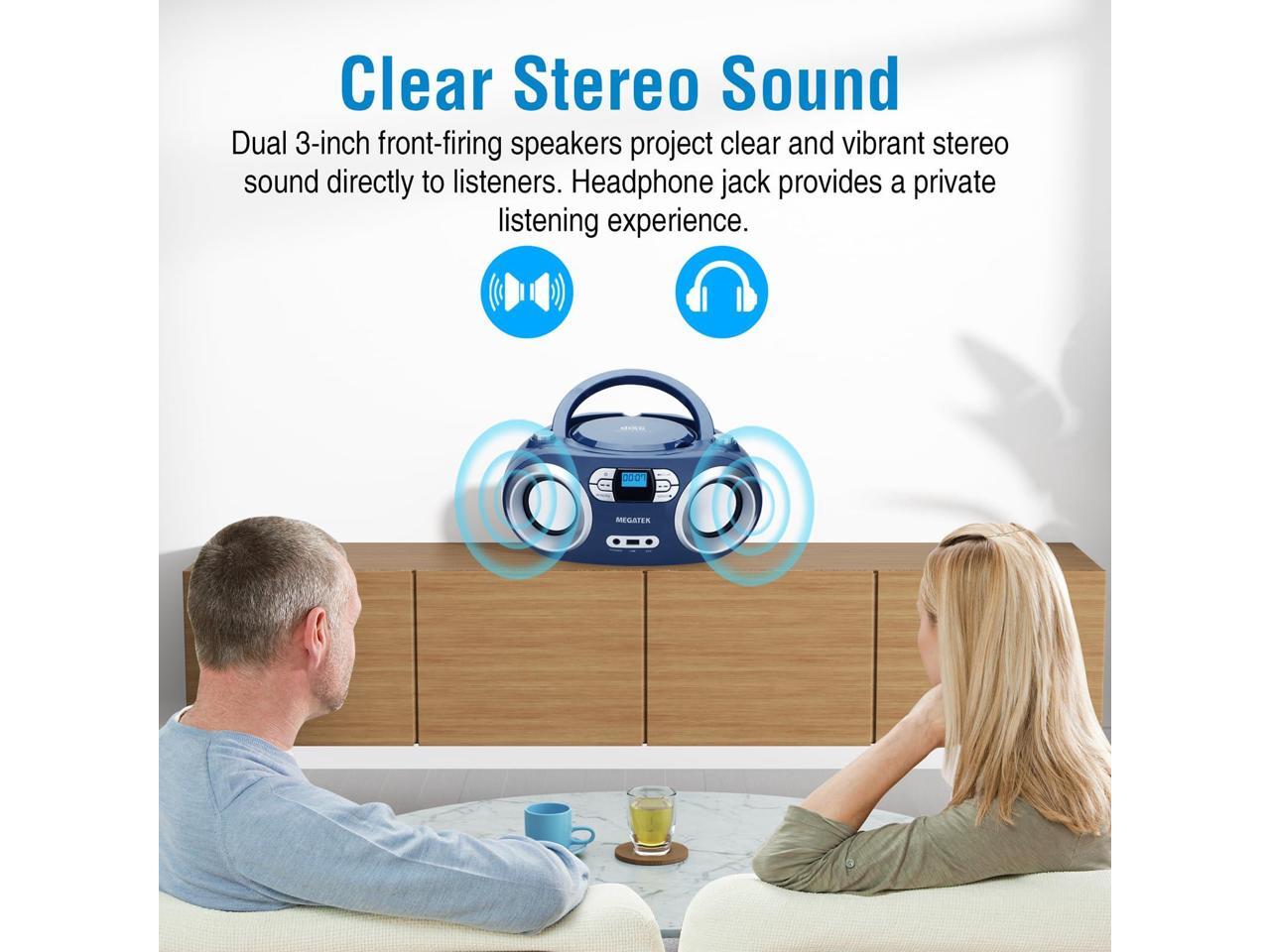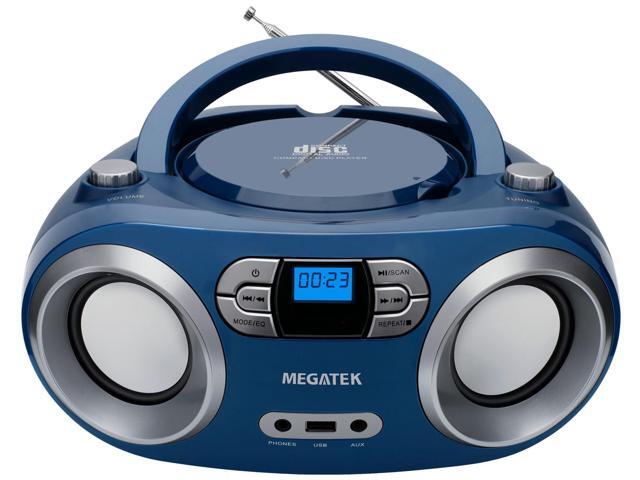 MEGATEK Portable CD Player Boombox with FM Radio, Bluetooth, USB Port, AUX Input, and Headphone Jack CD-R/CD-RW/MP3-CD Compatible, Clear Stereo Sound, Backlit LCD Display Blue Jay