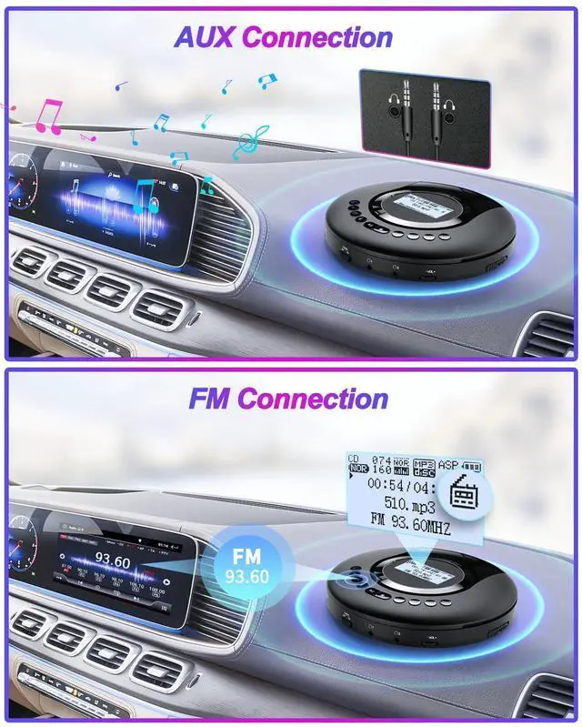 - FM Transmitter: cd player for car can transmit 5 different frequency: 79.3--88.5--93.6--101.9--107.1. When car fm system search the same frequency with the cd player, you can hear the music of the disc.