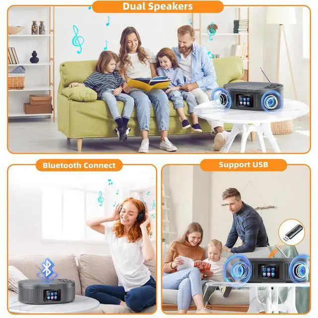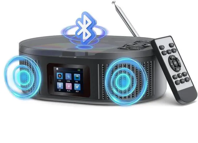 Bluetooth CD players for HomeThis CD player portable with is Bluetooth transmitter and receiver, is different from other players. It also can connect to phone, laptop, tablet to work as a bluetooth speaker. Upgraded dual speakers provide the clearer and louder sound and the volume can be adjusted as needed via buttons or remote.
