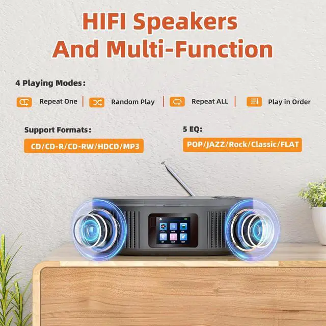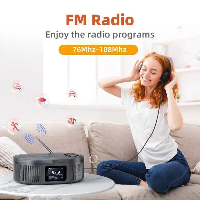 FM Radio CD PlayerThis boombox cd player offer 5 different modes (CD/Bluetooth/USB/FM/AUX). FM radio frequency is 76MHz -108MHz. You can listen to music, news, etc. from various channels whether you are in the car or at home.