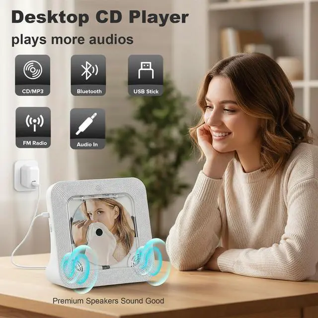 This radio cd player combo for home is a space-saving vertical cd player, it plays CDs, acts as a usb cd player, and streams music wirelessly. The clear cd player design showcases your discs in style. Enjoy personal listening by connecting cd player with headphones or fill room with stereo sound