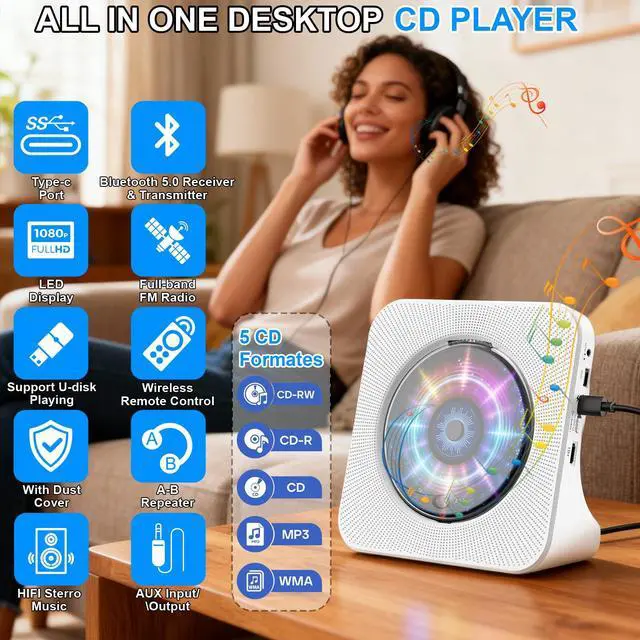 CD Players for Home:Portable CD player features five modes for meeting your music enjoyment:CD mode,Bluetooth mode,FM radio mode,USB mode,and AUX/LINE mode.It supports CD,CD-R,CD-RW,MP3,WMA audio formats.There is a 3.5mm jack and USB port, user could play music from external devices such as MP3 and mobile phones or connect it to headphones.Also you can set play time(30-80 minutes)for drifting off to sleep or enjoy a romantic and wonderful night.