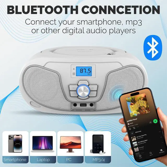 FM Radio with Digital Tuning This portable cd player with speakers and cd player with bluetooth combines classic playback with modern convenience. Enjoy FM radio with 30-station memory, and the easy-to-read LCD display makes this cd player portable and simple for all ages to use.