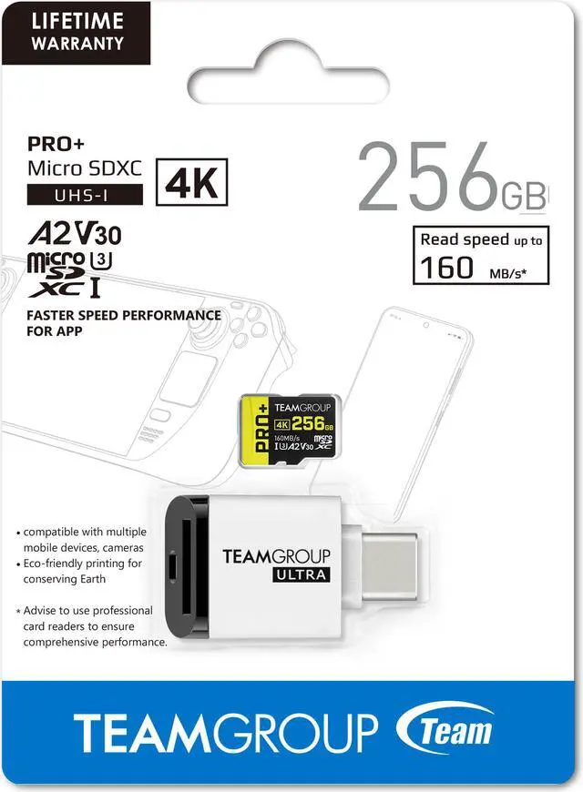 | Features | **Ultra CR I Card reader** File Transmission at 180 MB/s Allows for High-Speed Transmission Without Waiting Miniature Size for Easy Portability USB Type-C Interface Is Compatible with Various Devices Eco-friendly Recyclable Packaging for Earth Conversation Rigorous Testing and Verification Delivers Trustworthy Quality **Pro+A2 microSD card** Designed for 4K high-resolution videos, images from continuous shooting Eco-friendly printing for conserving Earth Well performed under extreme conditions Durable design for comprehensive protection |