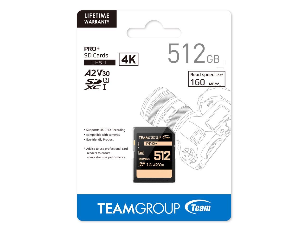 Team Group 512GB PRO+ SDXC U3 V30 A2 4K SD Card, Read/Write Speed Up to 160/90MB/s (TPPSDX512GIA2V3001)