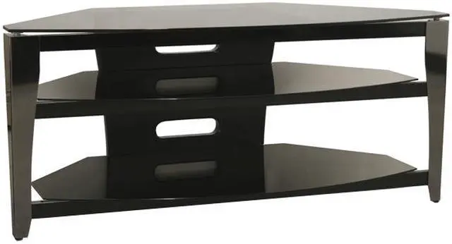 | Feature | 48" Wide TV stand fits most 50" and smaller Flat Panels Angled back design makes it great corner stand Brilliant black glass with stylish curved front Ample space for component storage and wire management |