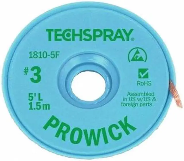 Desoldering Braid, Braid Number 3, Braid Width 0.075 in, Spool Length 5 ft, Color Green, Lead Content Lead-Free, Bobbin Type ESD-Safe, Flux Type Rosin, Flux Classification ROL0, Features Anti-Static Spool, Fastest Wicking Action, Rosin Flux Coated Desoldering Braid, Manufacturer Series Name Pro-Wick, Standards IPC J-STD-004, MIL-F-14256, NASA NHB 5300 4 (34-1), NASA NPC 200-4, NASA SP5002. This item has been restricted from sale in the following state (s): []