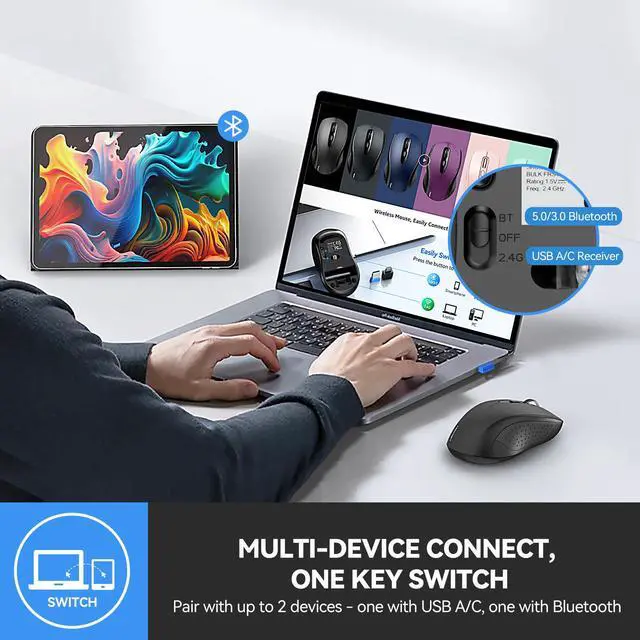 | Answer | This 2-in-1 wireless mouse offers USB-A and Bluetooth connection. BT mode supports Mac Book/Chrome Book, USB-A mode supports desktops/laptops and devices with USB-A port, cannot connect though WiFi. |