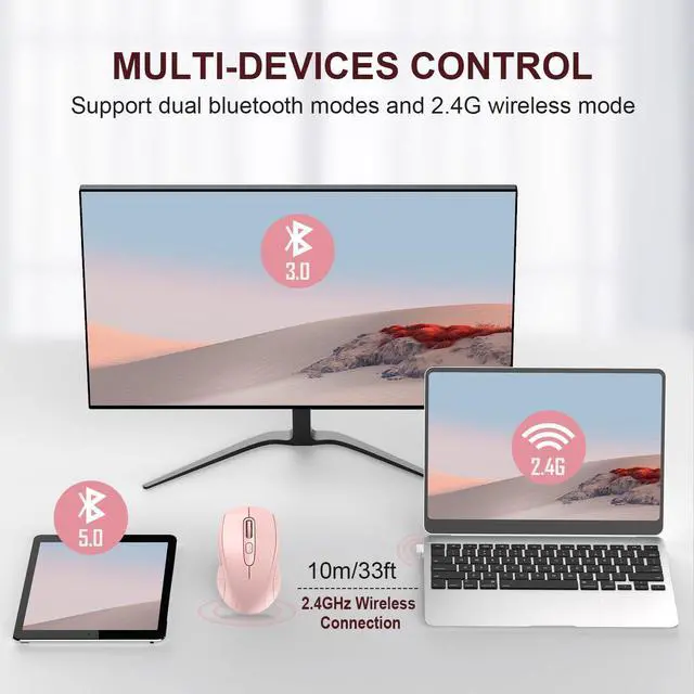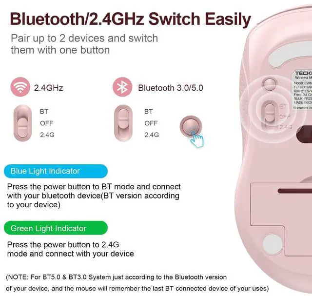 NOTE: If you have two devices with bluetooth function, one with Bluetooth 3.0 and the other with Bluetooth 5.0, the bluetooth wireless mouse only supports connecting to one device and CAN NOT connect to both 3.0 and 5.0 simultaneously