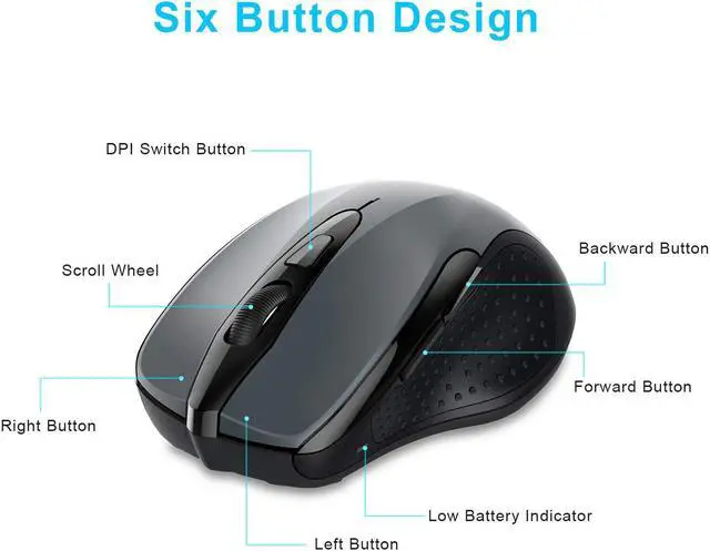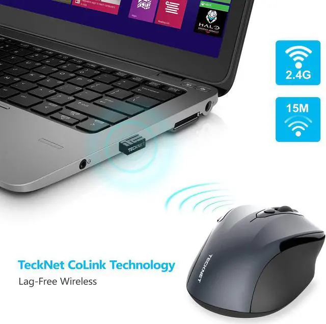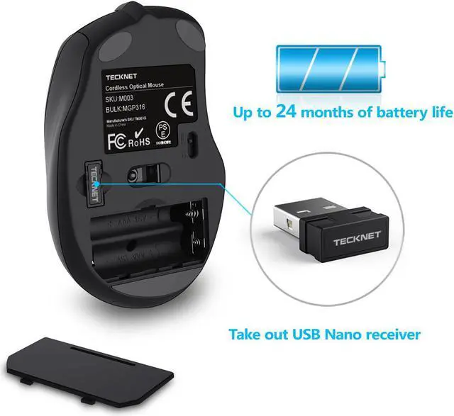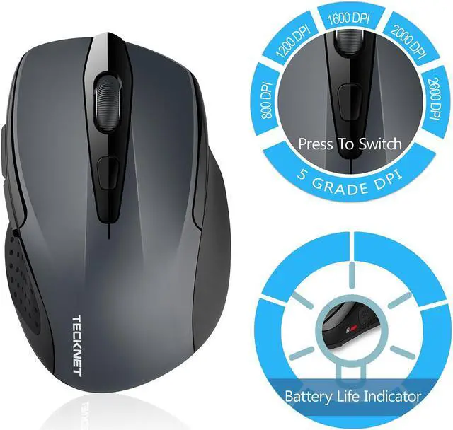 Plug & Play - Comes with a tiny USB Nano receiver (stored within the back of the mouse), just plug it into your PC and then forget it. 5 Adjustable DPI Level (2600/2000/1600/1200/800) - choose your own cursor speed. 2.4GH z Wireless Mouse- Ensures a reliable connection with an increased working distance of up to 33' (15m) and eliminates delays, dropouts, and interference. Contoured shape with soft rubber grips provides all-day comfort. TeckNet Tru-Wave Technology - Provides precise, smart cursor control over many surface types. TeckNet Co-Link technology – after pairing there’s no need to re-establish pairing after a signal loss or shutdown.