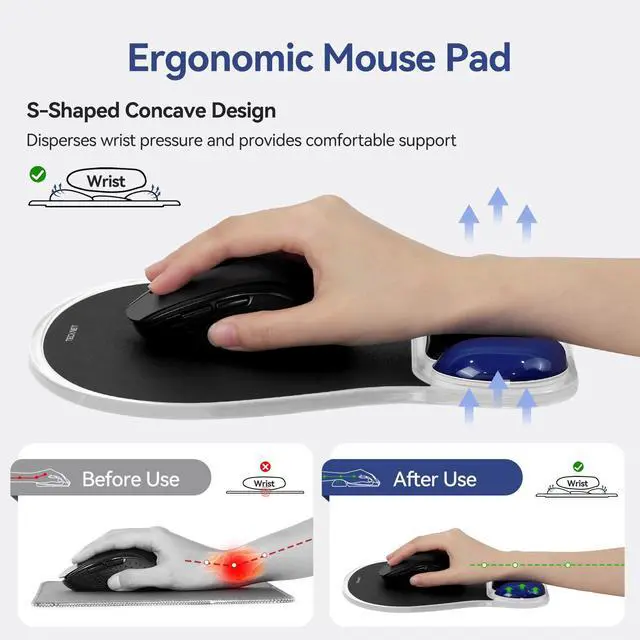 "S" Ergonomic DesignThe "S" shaped wrist rest of this mouse pad with wrist support combines ergonomic design and visual appeal seamlessly. Its unique curved structure fits the natural shape of your wrist, reducing pressure during long hours of use. This ergonomic mouse pad not only provides reliable support but also stands out with its distinctive, making it both a functional accessory and a stylish desktop addition.