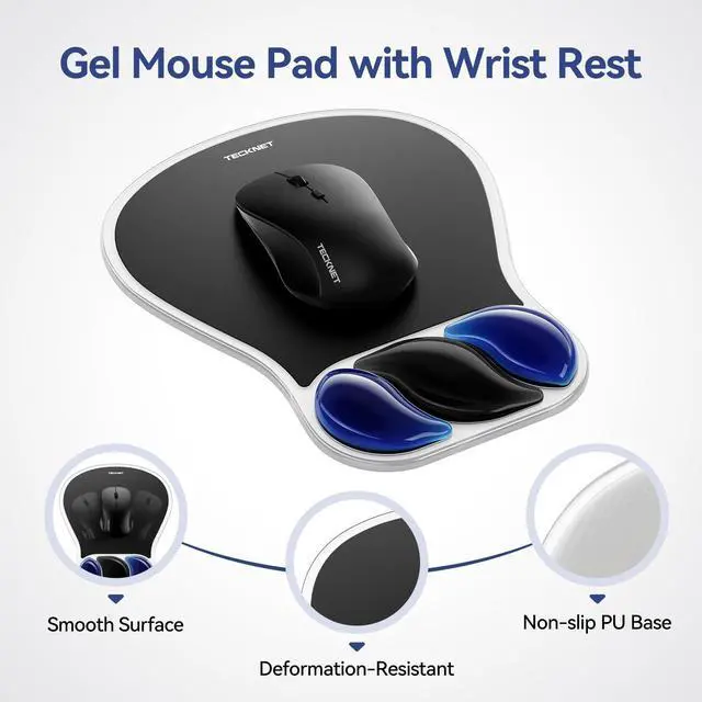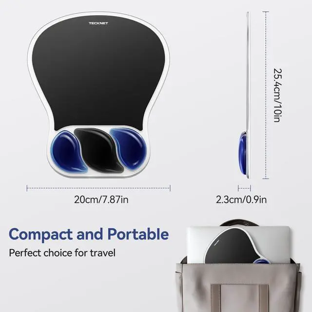 Gel Cushion, Comfort RedefinedTECKNET mouse pad features a high-quality gel-filled wrist rest, offering soft and comfortable support that perfectly contours to your wrist, providing just the right amount of cushioning. mouse pad with wrist rest optimal shape and generous size (10" x 7.87" x 0.9") allow for smooth and effortless mouse movement. The gel material boasts excellent elasticity, effectively alleviating discomfort caused by prolonged mouse use.