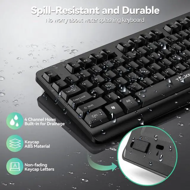 Spill-Resistant Design with Drainage HolesTECKNET spill-resistant keyboard designed for durability, it includes 4 bottom drainage holes to protect against minor liquid spills. Whether youre working with coffee, tea, or water nearby, it keeps your workflow safe and steady