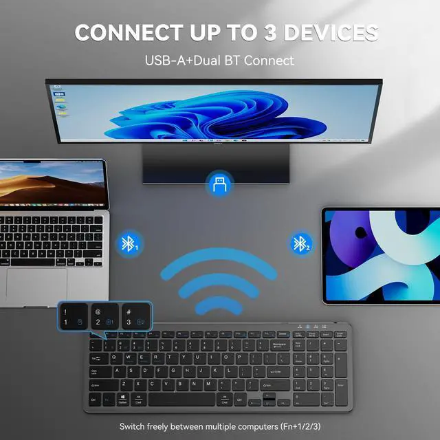 Elevate your workflow with the Ultra-Slim Wireless Keyboardcrafted for busy professionals and students. This low-profile computer keyboard combines a 0.46in thin ABS frame with triple connectivity (Bluetooth 5.0×2 + 2.4GHz USB) to pair with 3 deviceslaptops, tablets, or phones. Switch seamlessly between gadgets using shortcut keys, perfect for multitasking in offices or cafes. Enjoy quiet, fatigue-free typing thanks to scissor-switch keys. The full number pad and compact size (14.42x5in, 0.88lbs) slip effortlessly into bags for travel. Charge for 2 hours via USB-C for 90-day use, with auto-sleep to conserve power. Fully compatible with Windows, macOS, iOS, Android, Linux, its the ultimate multi-device keyboard for desktops, MacBooks, iPads, and dorm setups.