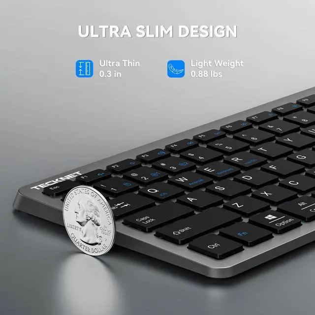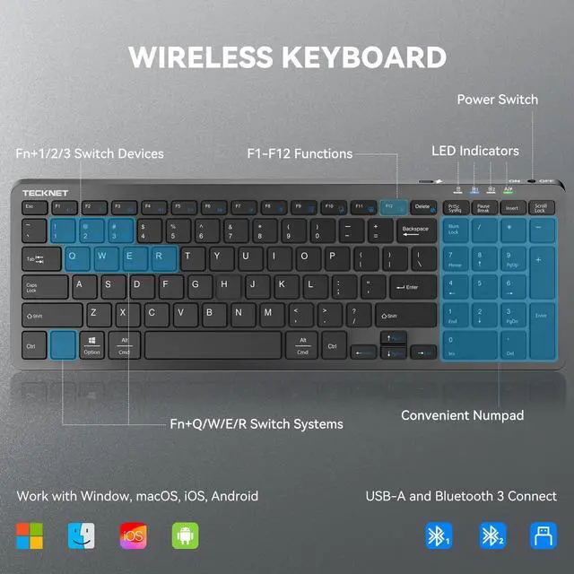 | Keyboard Description | 2.4GHz USB + Bluetooth Wireless Keyboard with Number Pad, Scissor Switch Low Profile, Compact Size |