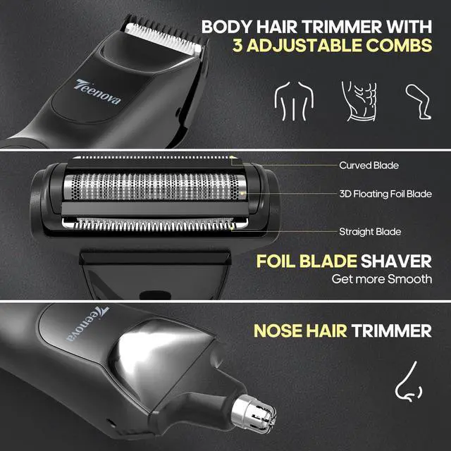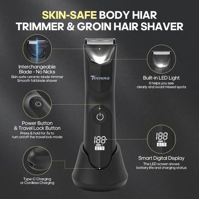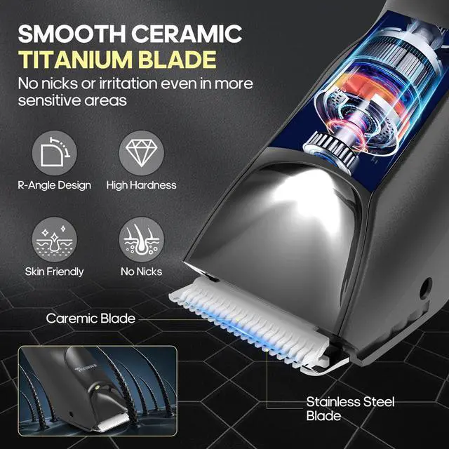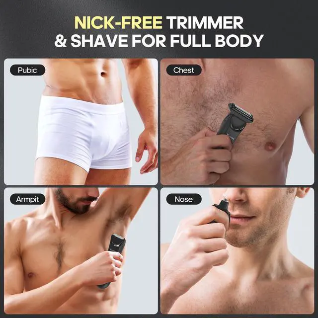 3-in-1 Versatility Body Grooming Trimmer - Experience the ultimate grooming flexibility with interchangeable ceramic blade head, foil shaver head and ear and nose hair trimmer head. Driven by a powerful 7200RPM motor, this body groomer delivers a smooth, irritation-free trimming and precise shave on most of body part, such as pubic, bikini, groin, leg, armpit, chest etc ( Please do not use it to trim scrotum or testicles for safety). Body grooming kits for men & women.