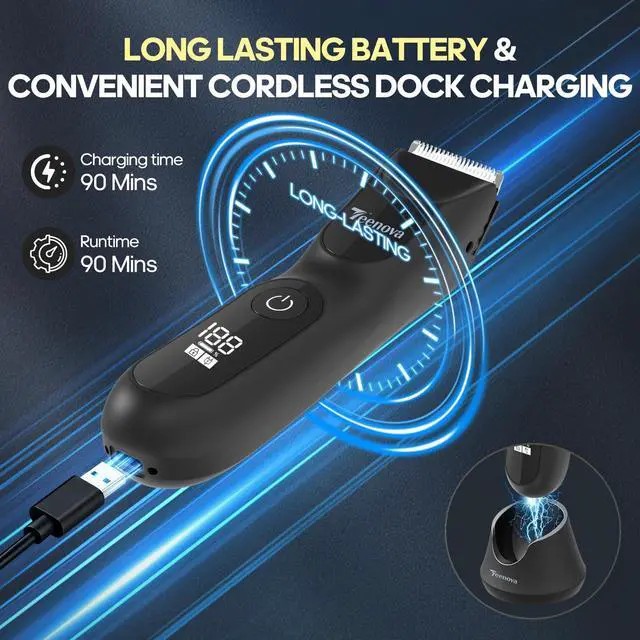 USB Cable & Wireless Dock Charging - The body hair clipper fully charges in just 1.5 hours and delivers up to 90 minutes of runtime. The included standing charging dock provides a dedicated place for your trimmer. Simply place it back after use to start chargingno fumbling for cables. This not only keeps your space organized but also stores the body hair removal upright, ensuring the blades remain dry, clean, and free from odor-causing residue.