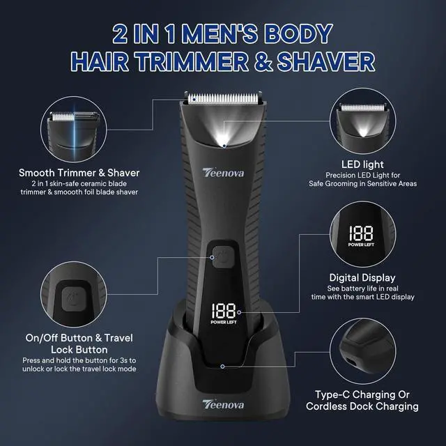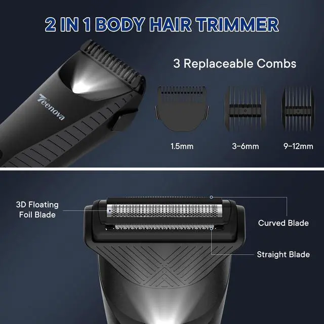 2 In 1 Mens Full Body Grooming Kit - This versatile male pubic hair trimmer includes two specialized attachments: a groin & body trimmer and foil shaver. Whether you're trimming body hair, or detailing sensitive areas, this all-in-one body shaver delivers seamless performance for every grooming need. Ideal for pubic, bikini, groin, legs, armpit, chest etc. (Not recommended for beard shaving.)