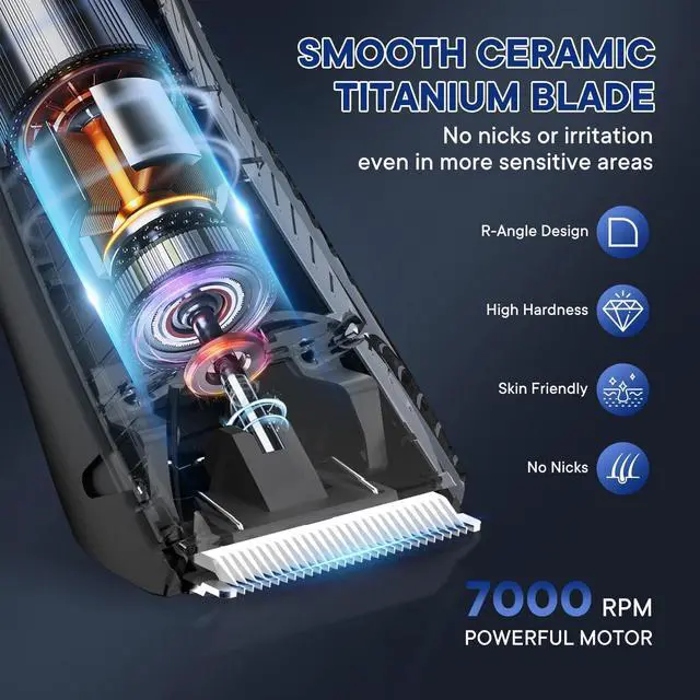 Skin-Friendly Ceramic Blades for Gentle Precision - Engineered with soft ceramic blades and R-shaped rounded tips, this pubic hair clipper glides smoothly over sensitive skin without pulling, nicking, or irritation. It includes three precision guards (1.5mm, 3-6mm, 9-12mm) to customize your trim. The 1.5mm guard is perfect for an ultra-close finish.