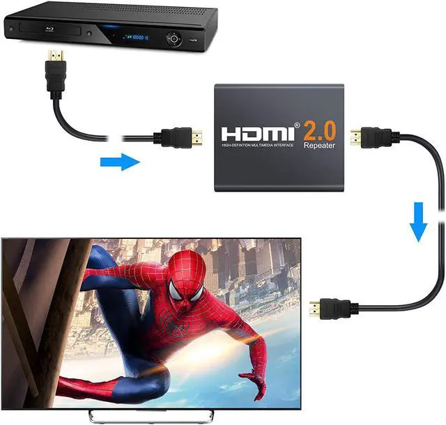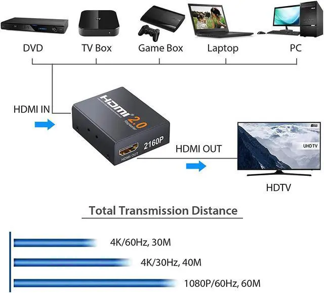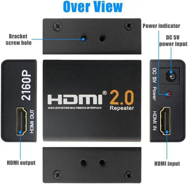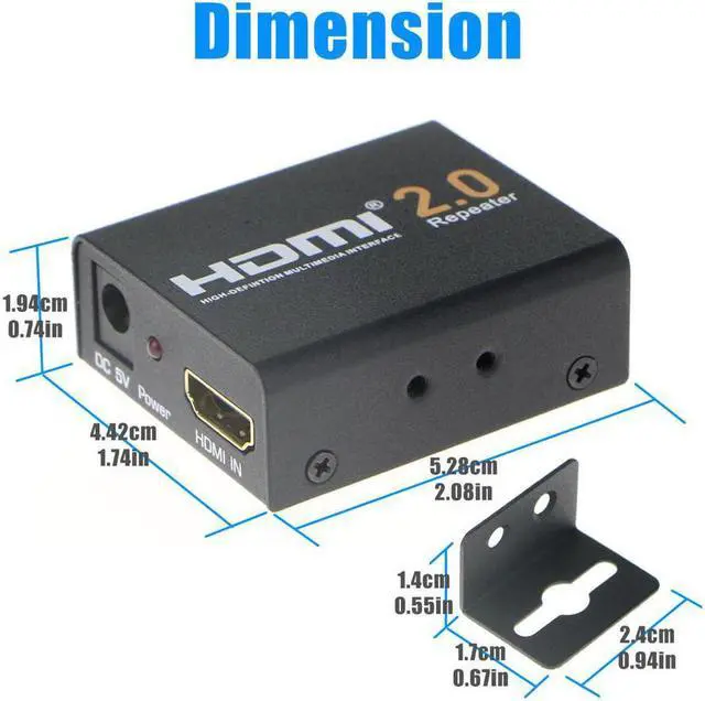 Features: Ideal for data center control, information distribution, conference room presentation, school and corporate training environments Support HDMI 2.0 and backward compatible with HDMI 1. x version 2160P 3D 4K HDMI Signal Repeater Extender Booster Adapter Over Signal HDTV 60 Meters Lossless Transmission Serial data rate up to 6.0 Gbps, support ultra-high resolution 4K/2K @ 60 Hz Mini size and metal case, just plug and play, no extra power supply needed Audio and video signal transmission without delay or loss Supports HDCP 2.2 and 3D transmission