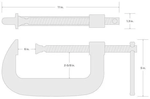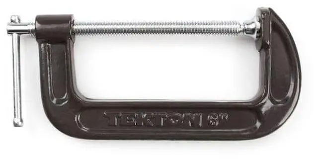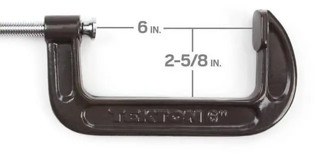| Features | With a jaw opening of 6 in. and a throat depth of 2-5/8 in., the TEKTON 6 in. Heavy-Duty C-Clamp can take on woodworking, fabrication, and automotive projects. It features a heavy-duty, malleable steel frame with a durable, baked enamel finish. The chrome plated steel screw has a swivel pad that adjusts to work piece. Tighten or loosen the clamp using the sliding T-bar handle. |