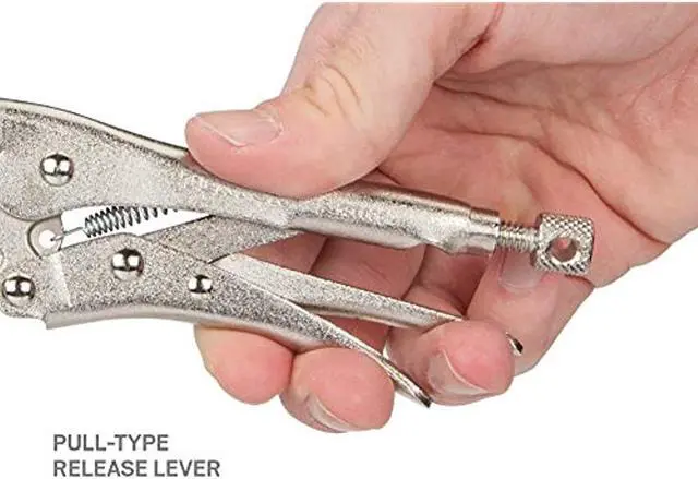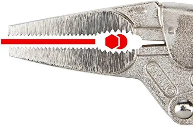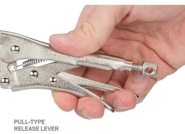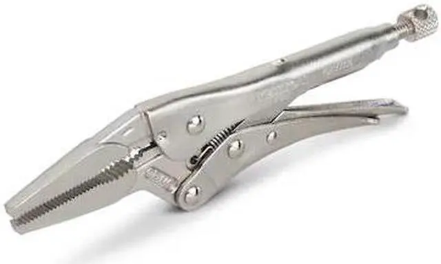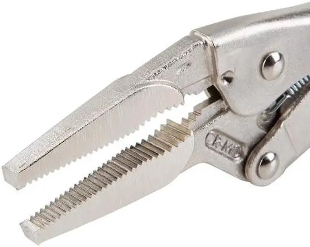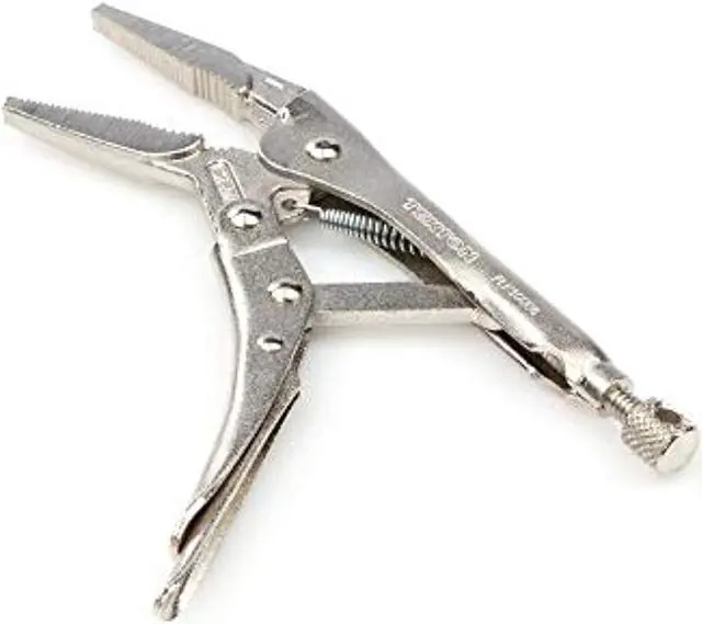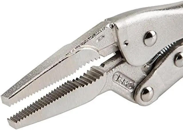 TEKTON 6-Inch Long Nose Locking Pliers | PLK30006 About this itemLong nose straight jaw with curved profile section reaches into narrow spaces and holds round, hex, and square shapes, flat stock, and sheet materials ^^ Strong chrome molybdenum jaws with sharp teeth provide a sure bite ^^ Pull-type release lever works like a trigger for controlled one-handed operation and fast repositioning ^^ Generously sized tension adjustment knob offers a large, nonslip knurled surface and a through hole for added leverage with a second tool ^^ ›