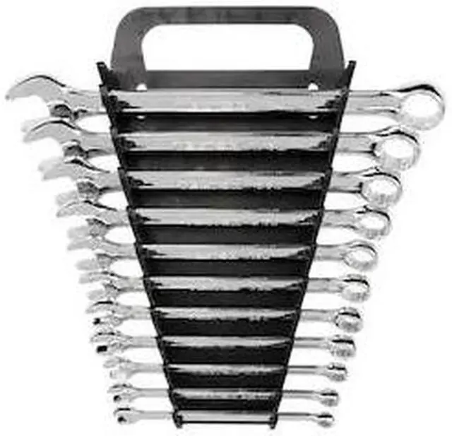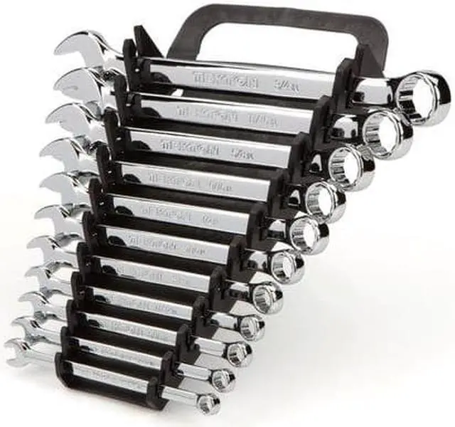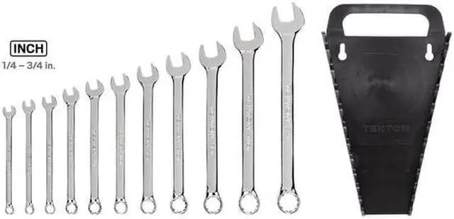 The TEKTON 11-pc. Combination Wrench Set is a complete inch set with every size from 1/4-3/4 in. Open end is angled 15° and the box end is designed to grip flat sides of fastener heads, not corners, to prevent round-off. Set comes with wrench holder, a versatile organization solution with a space-saving folding handle.