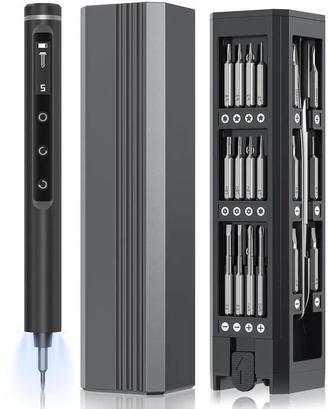 3.7V Mini Electric Screwdriver, 50-in-1 Precision Screwdriver Set A compact, small electric screwdriver kit with 5 torque settings, OLED display, and 4 LED lights for electronics repair. 5 Adjustable Torques This mini electric screwdriver set offers 5 electric torque levels (0.1N.m0.5N.m) and manual torque up to 5N.m. Perfect for repairing PCs, phones, cameras, watches, drones, and more. Long-Lasting Battery The cordless electric screwdriver features a 500mAh Type-C rechargeable battery (1-hour charge). Delivers 1,100+ screws per charge, with 230+ minutes (gear 1) or 120+ minutes (gear 5) runtime. User-Friendly Design OLED display shows power/torque data. 4 shadowless LEDs ensure precision in dark spaces. One-click magnetic case organizes the 50-in-1 electric screwdriver kit for easy access. Powerful Performance 200RPM motor tightens screws in 4 secondsideal for electric screwdriver for PC repairs. Reduces wrist strain and boosts efficiency. 50-in-1 Electric Screwdriver Kit Includes: 1 precision electric screwdriver, 42 bits, storage box, tweezers, pry bar, suction cup, USB-C cable, and more.
