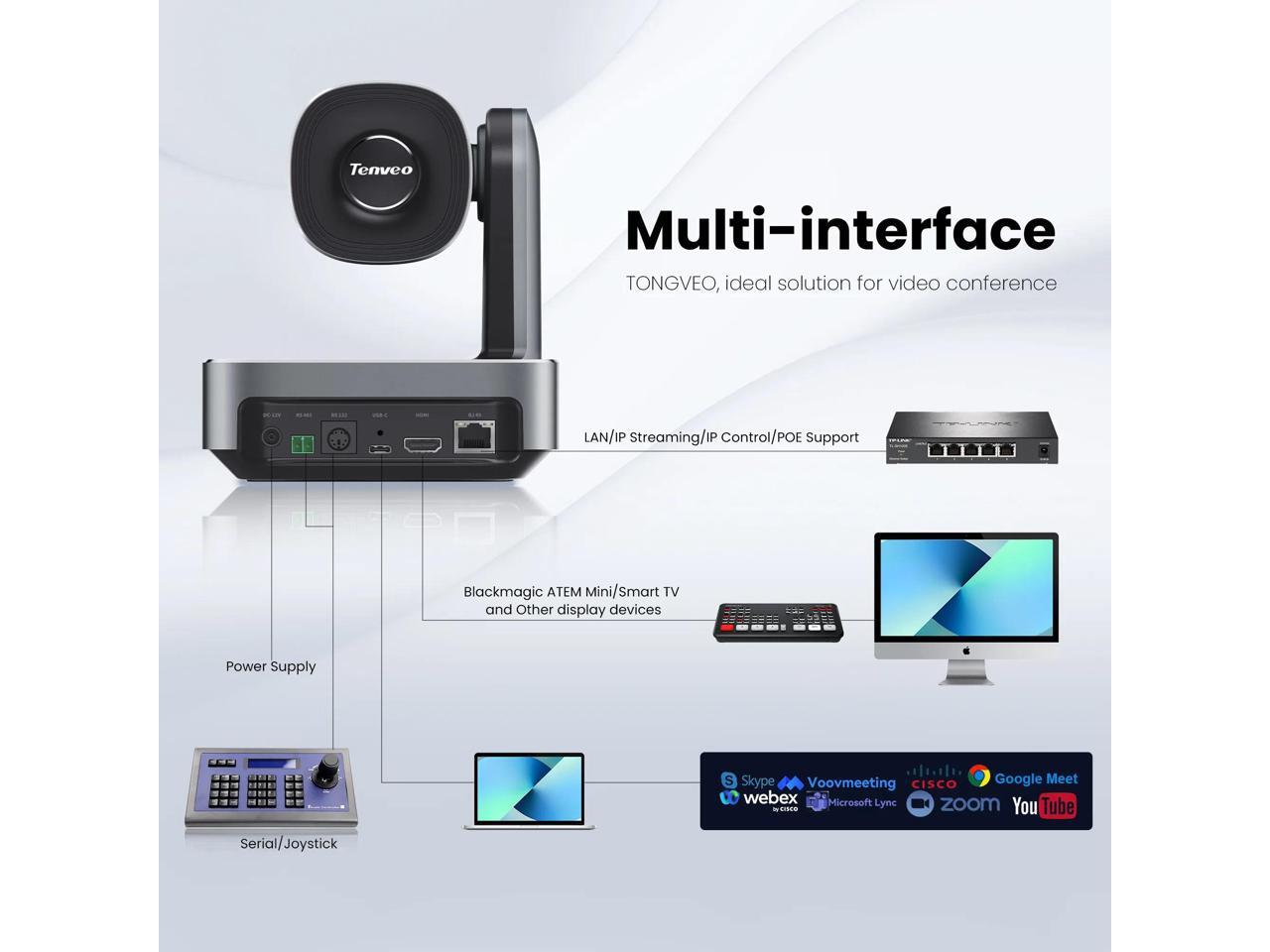 - Compatible with most leading video conferencing software: Zoom, Skype, Webex. Teams, Google meet and LIve Streaming software: vMix, OBS, Facebook Live, YouTube Live, Vimeo Live, Twitch, Wirecast, Livestream Studio, MimoLive, Tricaster, etc.