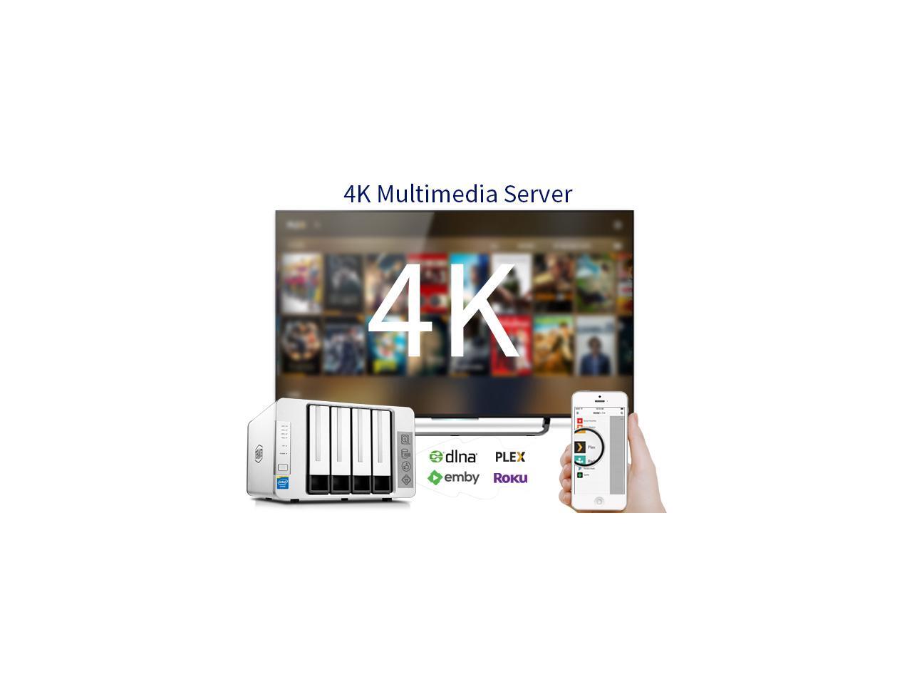 - [nas storage for home]PLEX supports 4K H.264 online Hardware transcoding, allowing 4K videos to be converted and played on the fly on other smart TV, smartphones, and media players that originally do not support Ultra HD formats