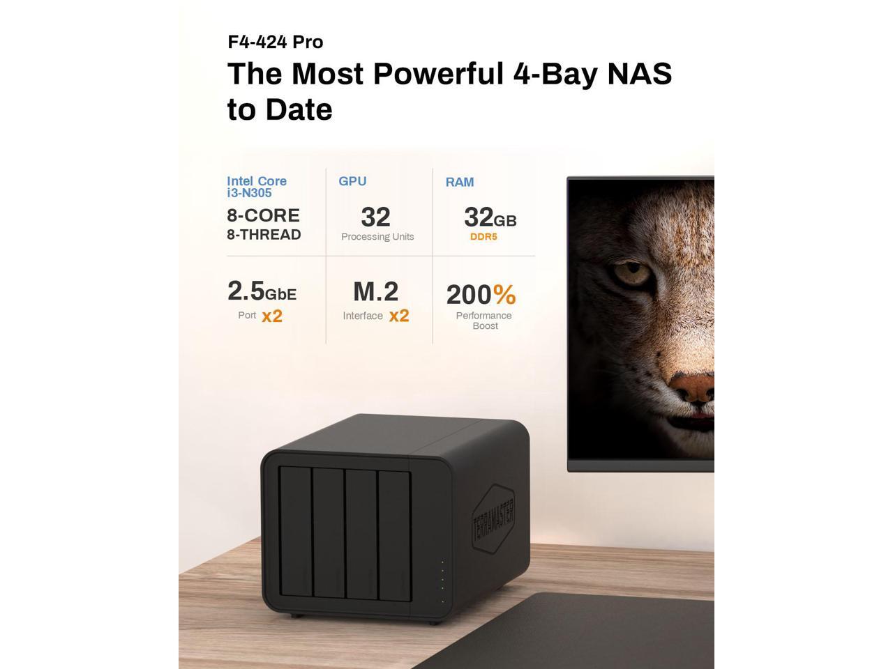- Peak Performance 4-Bay NAS: F4-424 Pro NAS storage with Peak Performance 4-Bay NAS: F4-424 Pro NAS storage with Core i3-N305, UHD GPU, 32GB DDR5 memory, dual Ethernet ports, and dual M.2 NVMe slots for SSD caching. Ideal for small and medium-sized businesses.