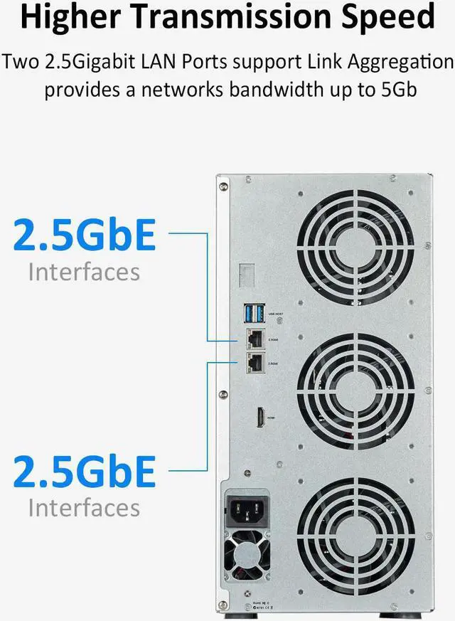- The T12-423 is configured with two 2.5 GbE interfaces, supporting 2.5 GbE high-speed network bandwidth. The transmission speed can reach 283 MB/s (Seagate IronWolf 18TB x 4, RAID 0). Link Aggregation provides a network bandwidth up to 5 Gb, thus providing a cost-effective solution for multi-user and high-concurrent file access.