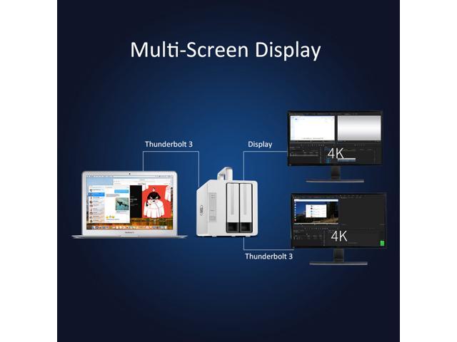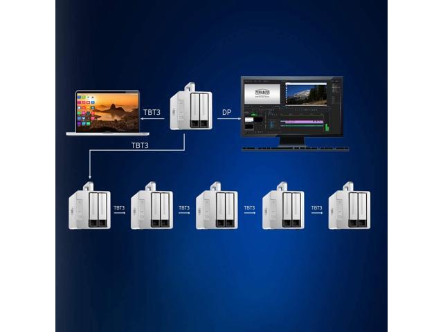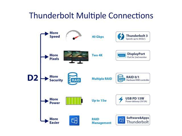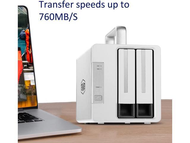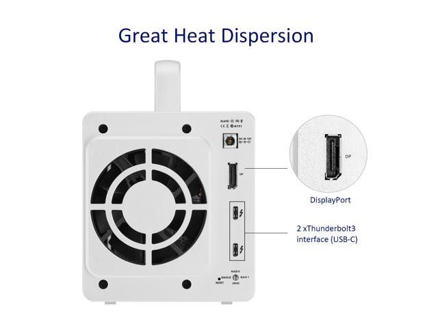 Two 40Gbps Thunderbolt 3 interfaces, reading speeds up to 760MB/s (with SSHD in RAID 0). Compatible with 3.5" and 2.5" SATA HDD, 2.5" SATA SSD.