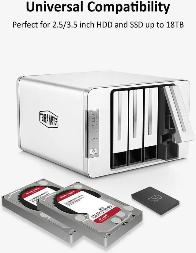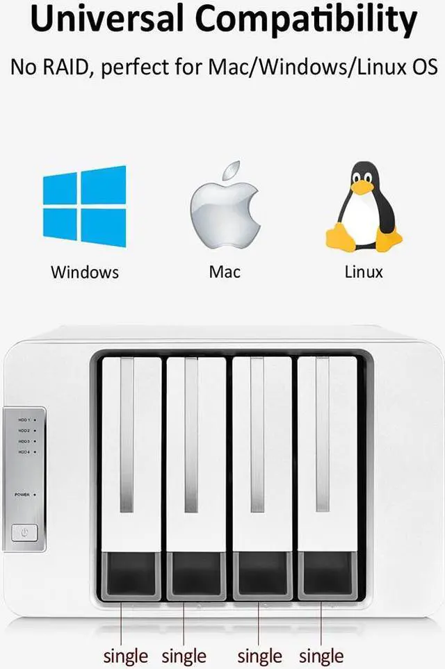 - Compatible with diverse 3.5-inch SATA hard drive brands and models, as well as with 2.5-inch SATA hard drives and SSDs. Equipped with 4 drive slots, supports a drive capacity of up to 20TB, and a total storage capacity of up to 80TB (Users need to purchase their own hard drives).