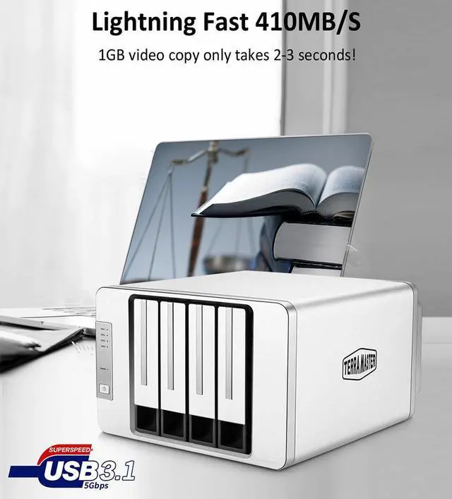 The D4-300 can quickly add storage space to your NAS. It can be used as an external hardware RAID device for TerraMaster NAS. The D4-300 features USB3.1 connection and supports SSD/HDD drives for high-speed data access and massive capacity.