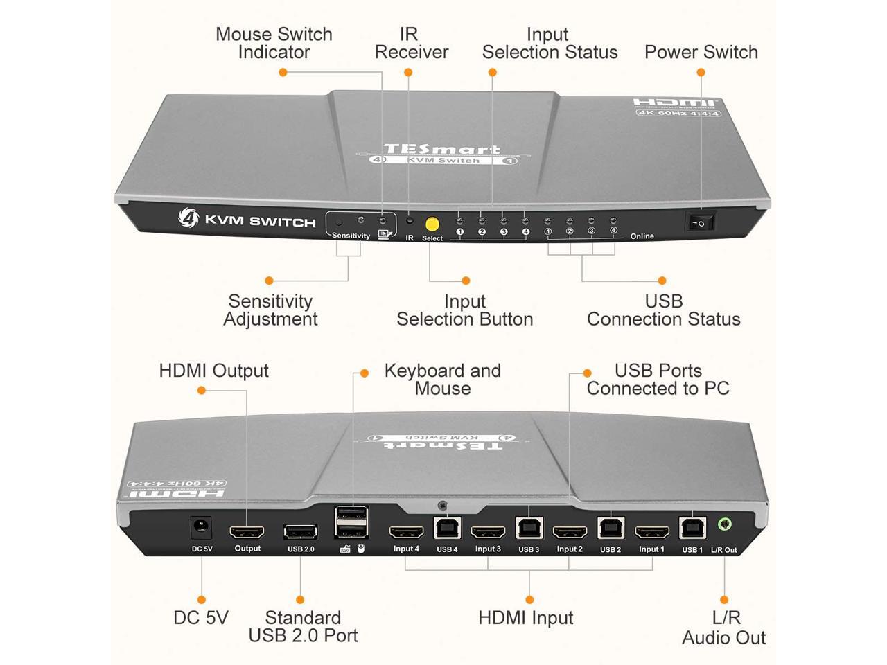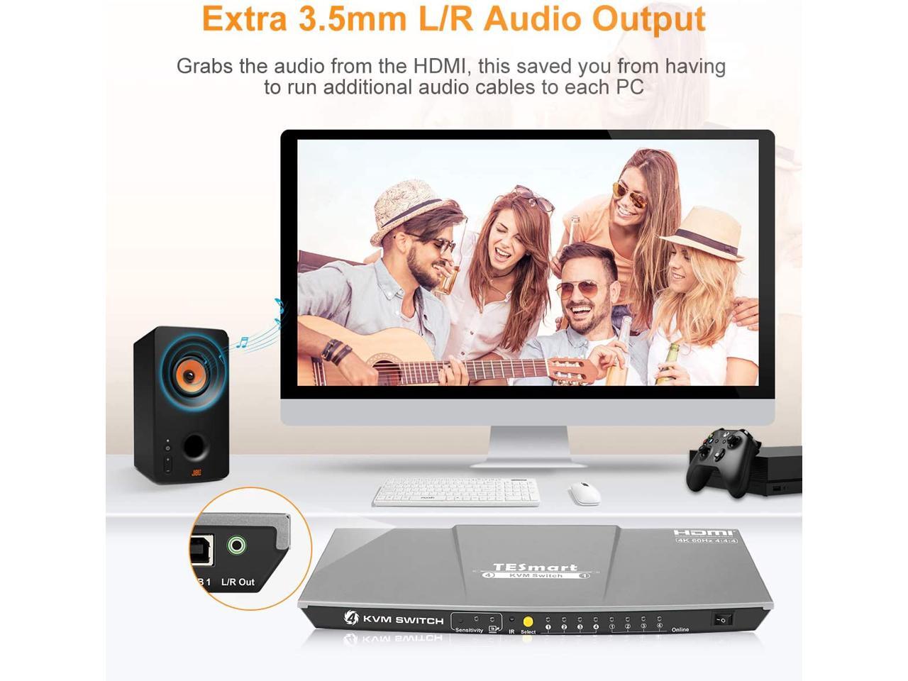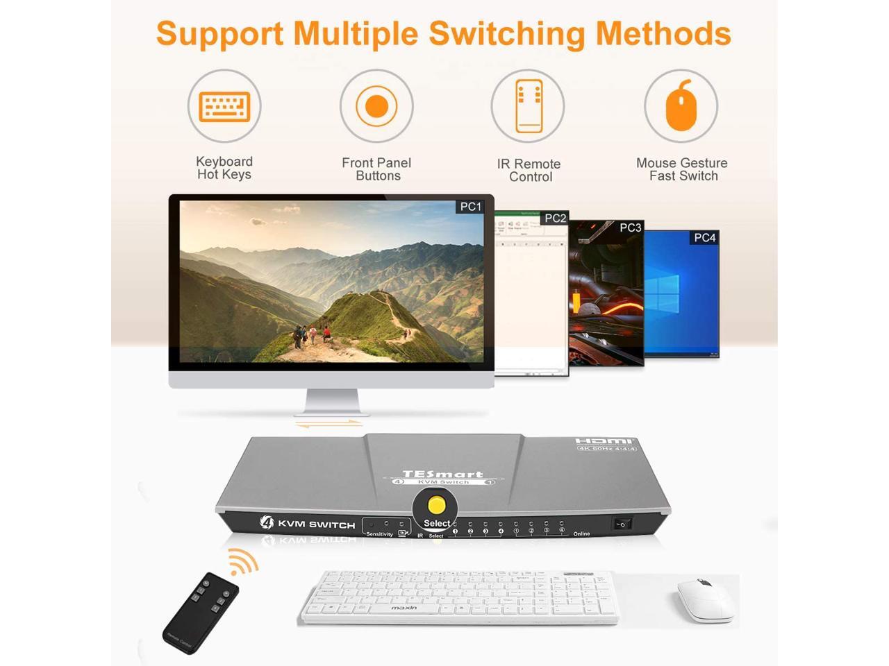 TESmart HDMI KVM Switch 4 ports 4 in 1 out , support 4k 3840*2160@60Hz 4:4:4 Support HDR 10 and Dolby Vision ,Complaint with HDCP 2.2, With USB2.0 and audio output interface