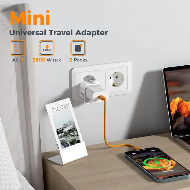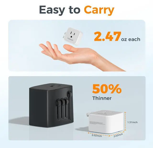 The size and weight of this travel adapter worldwide 2.02× 1.31× 1.24 in and 2.47 oz each. This compact universal adapter saves space in your suitcase and handbag.