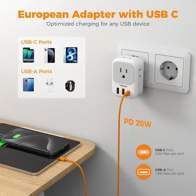 This European plug adapter with 4 electric Outlets and 3 USB Charger Ports accepts the standard N American 2 or 3 prong flat pin plug and USB charging, without blocking each other. The indicator can show the power of this Iceland power adapter is on/off.
