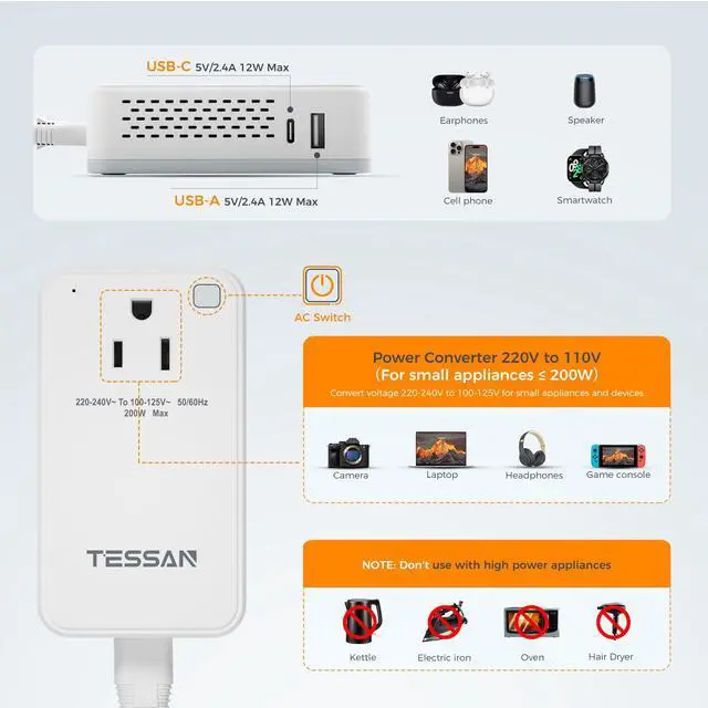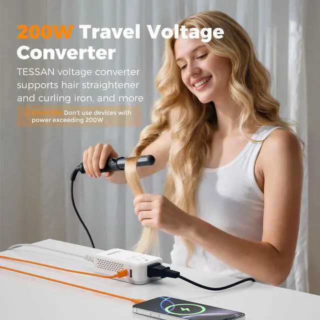 The power converter adapter combo supports hair straighteners, curling irons, electric toothbrushes, electric shavers, laptop and more, meeting daily needs. Note: Total power of connected appliances must not exceed 200W.