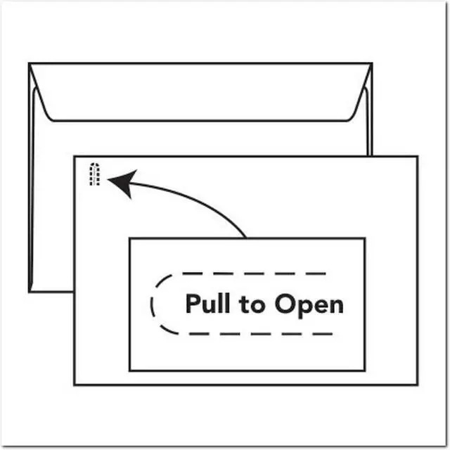 6" X 9", Side Seam Booklet, 24#, White Sulphite (SFI Certified) 92% Brightness, Vellum Finish, Two Side Seams Under, "Tear-ific" Tear Strip, Remoistening Seal, Flap Down, Pre-Printed with "Pull to Open"